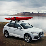 For single kayaks up to 45 kg. Can be tilted for easy loading and unloading. Kayak holder and tensioning straps are locked separately. Can only be used in combination with the roof rack.